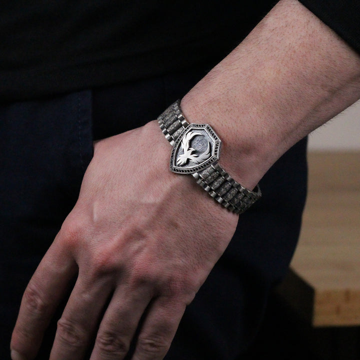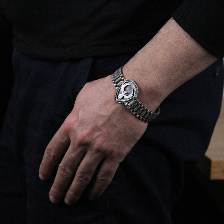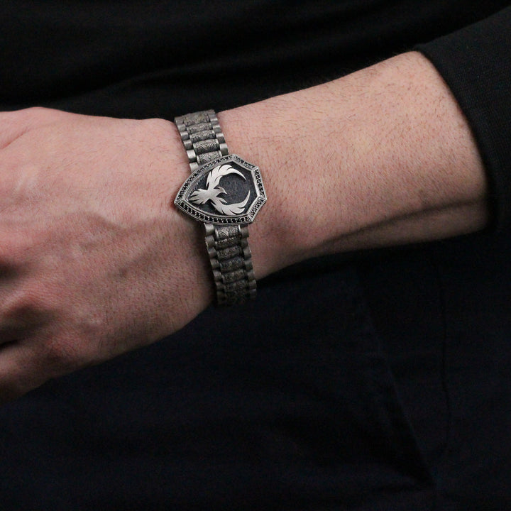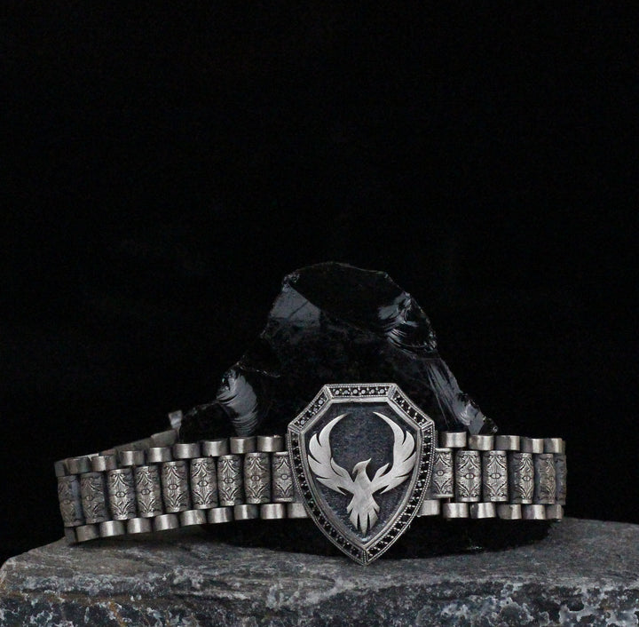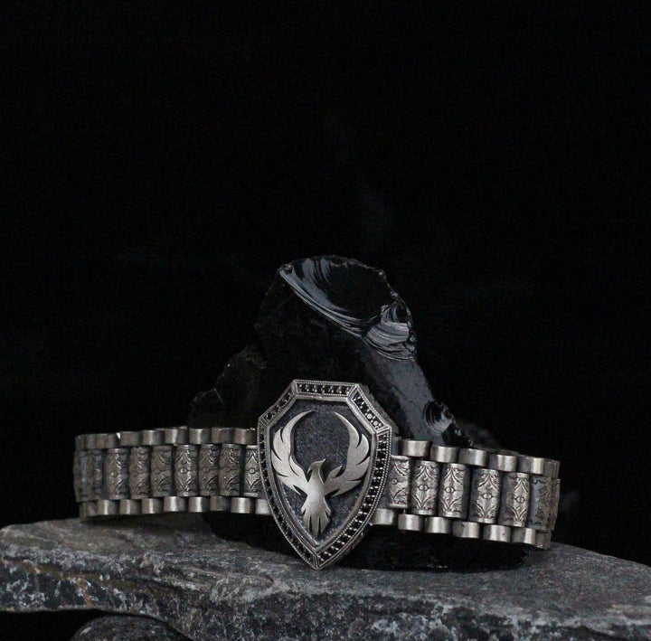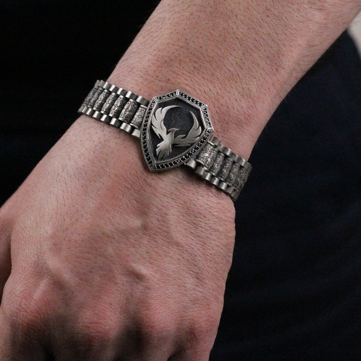 925K Sterling Silver Phoenix Bracelet | Bold Statement Firebird Shield Bracelet for Men