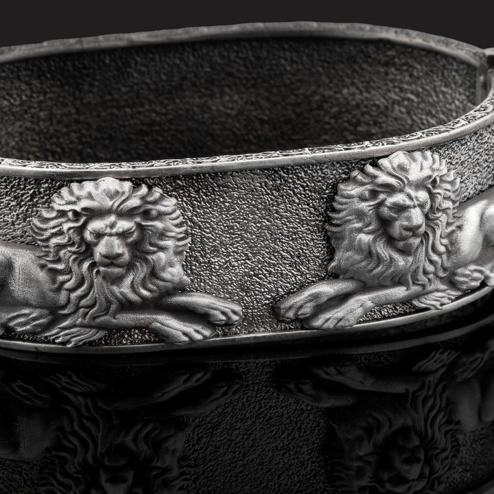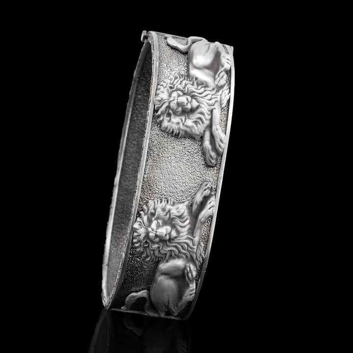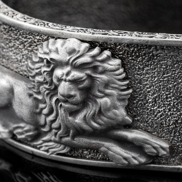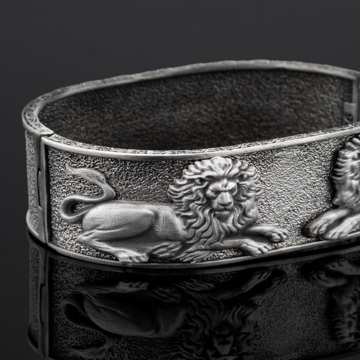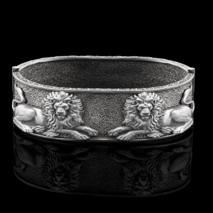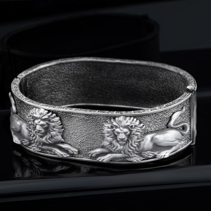 Men’s Sterling Silver Lion Bracelet – Bold Handcrafted Cuff with Reclining Lion Motifs