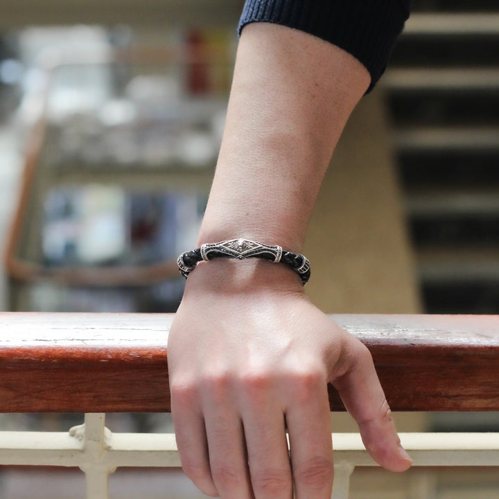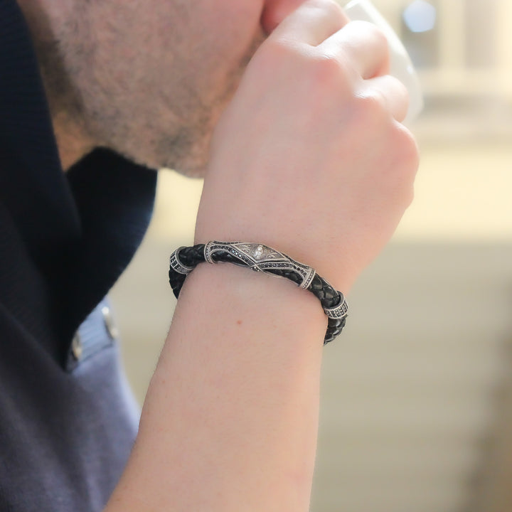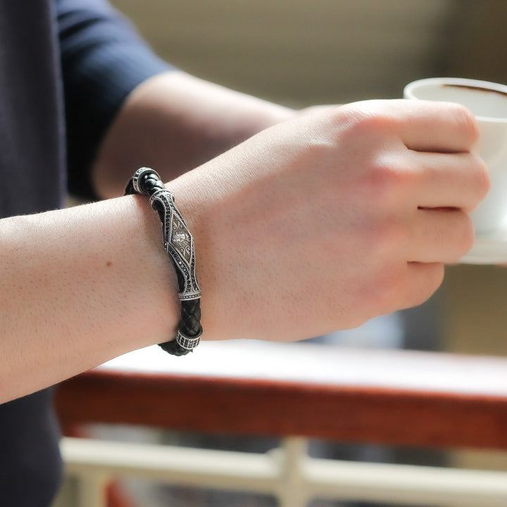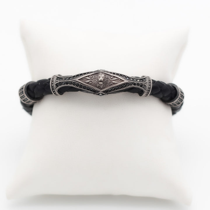 Sterling Silver and Leather Men's Bracelet with Lion Motif | Braided Leather Bracelet