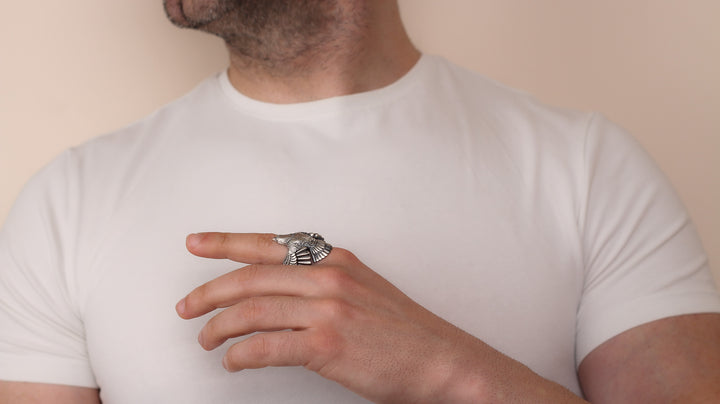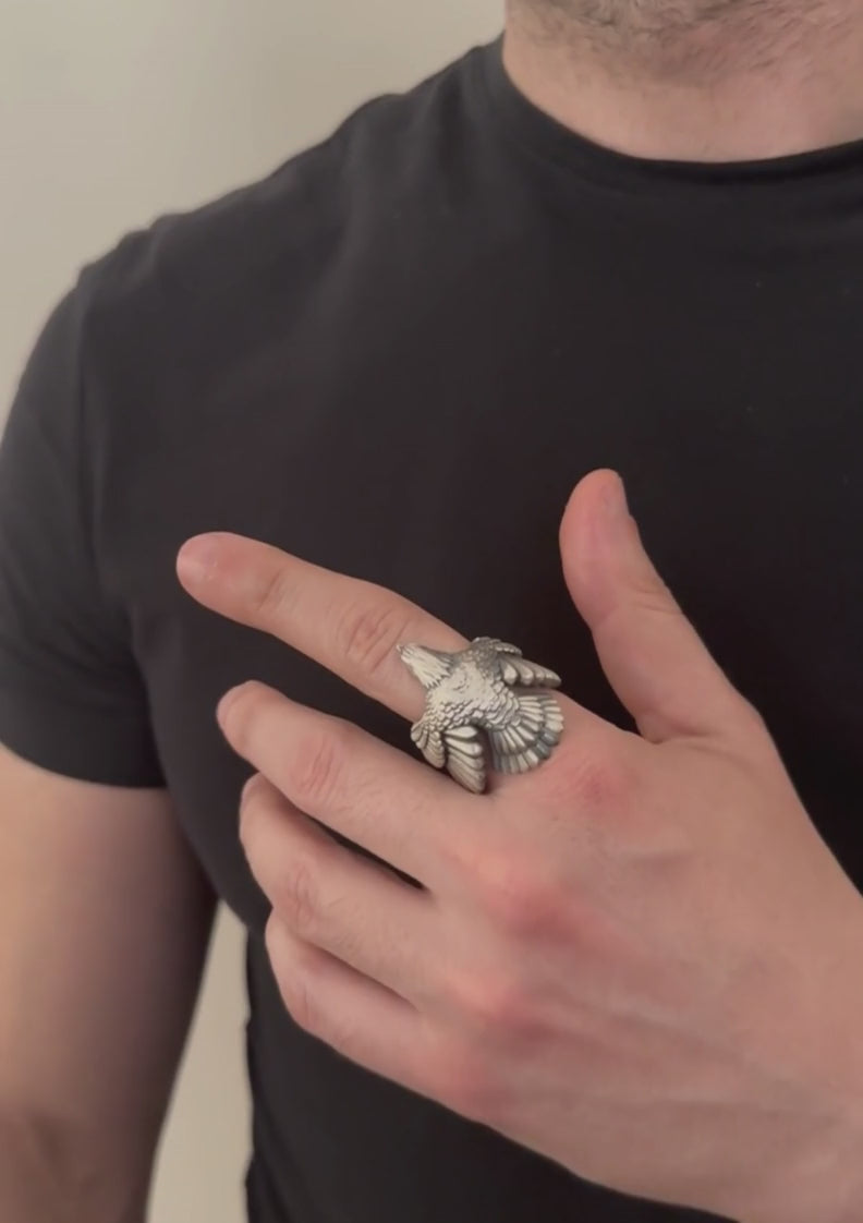 Soar with strength and freedom wearing the Sterling Silver Eagle Ring, a bold accessory designed for men who embody courage and individuality. Featuring an intricately detailed eagle in mid-flight with powerful wings outstretched, this handcrafted piece symbolizes leadership, resilience, and vision. Made from premium 925 sterling silver and finished with oxidized accents to highlight every detail, it’s a standout ring perfect for daily wear or as a statement piece for special occasions.