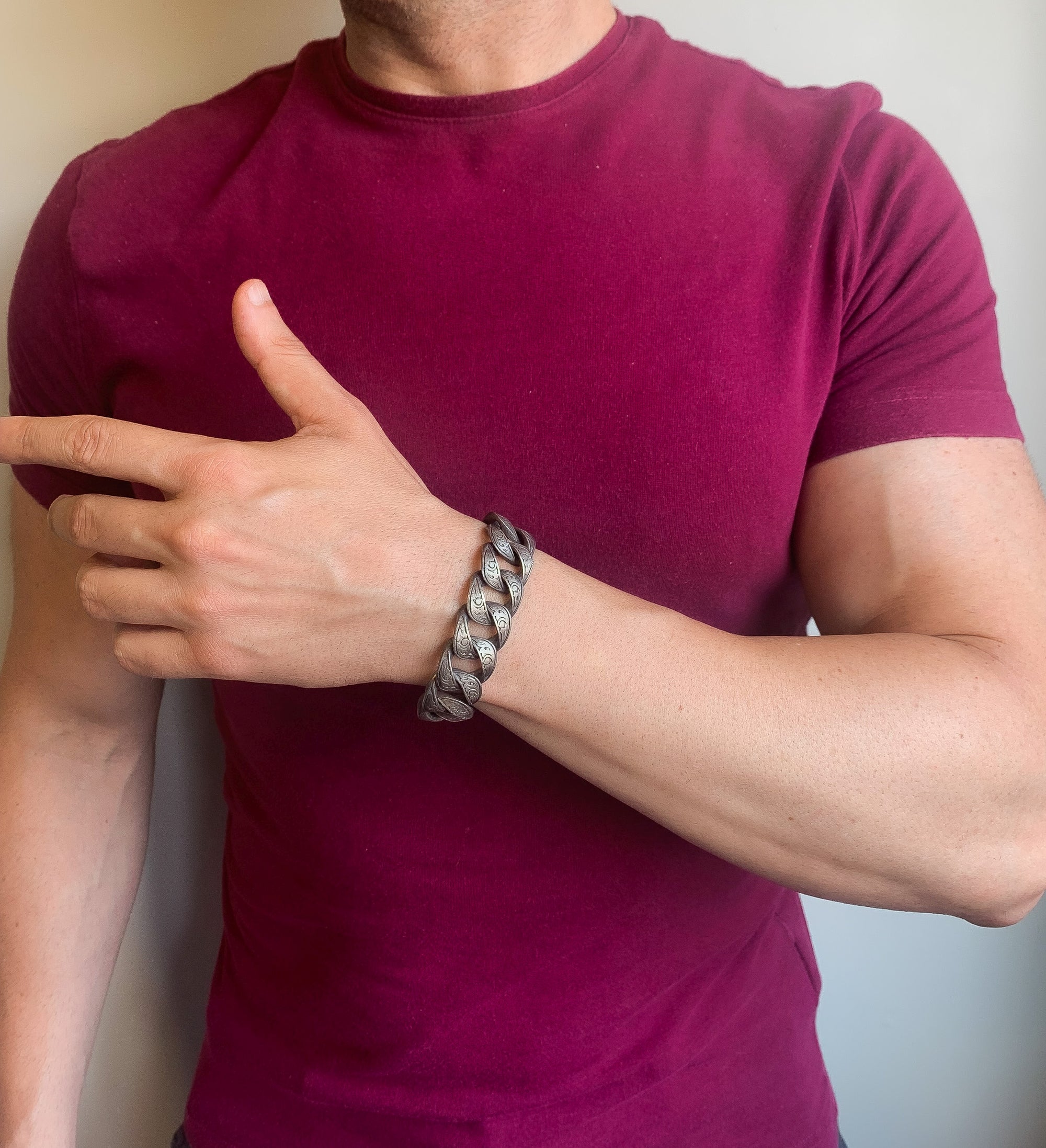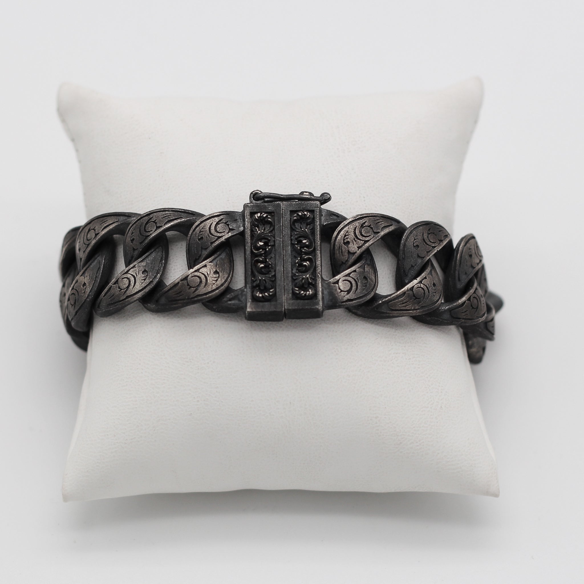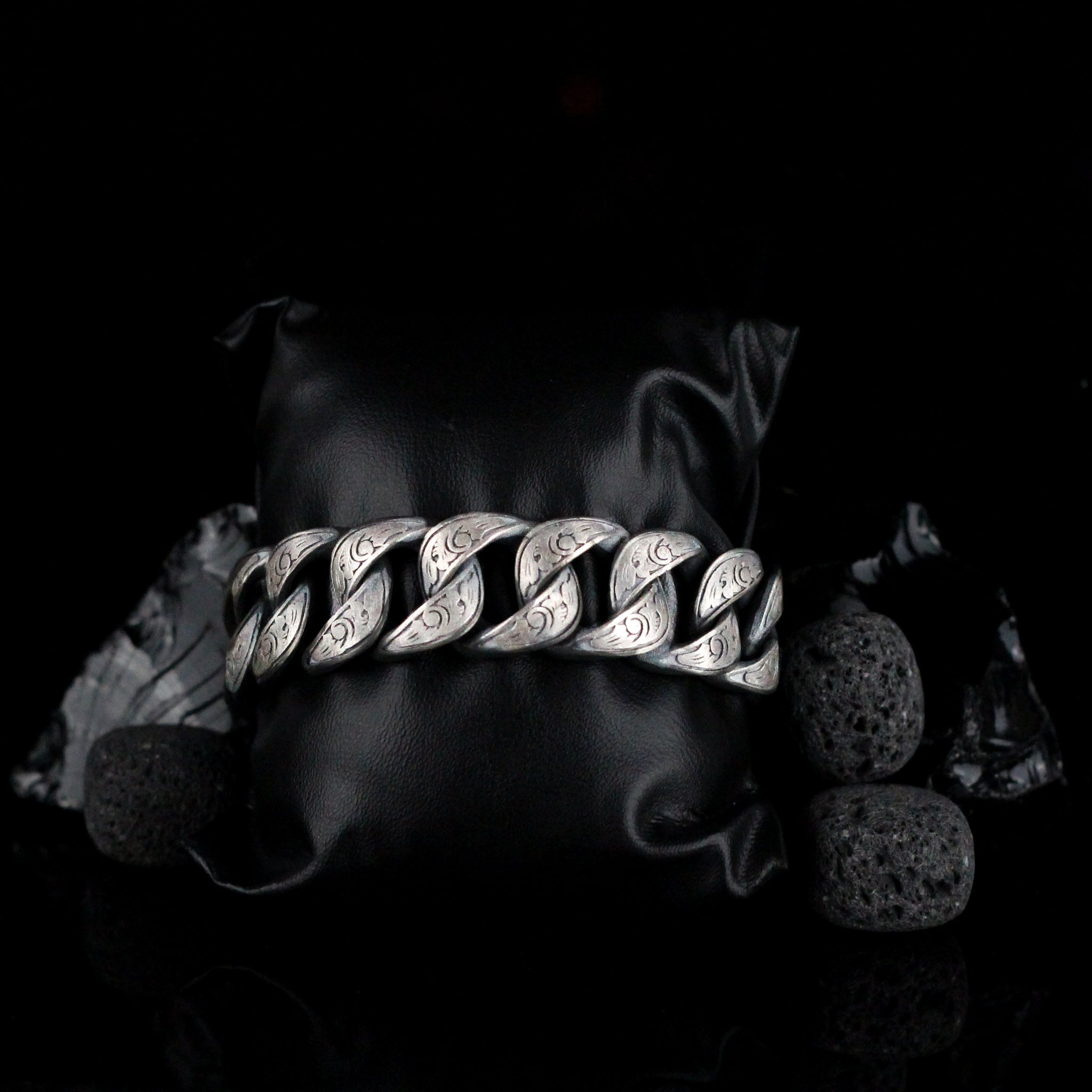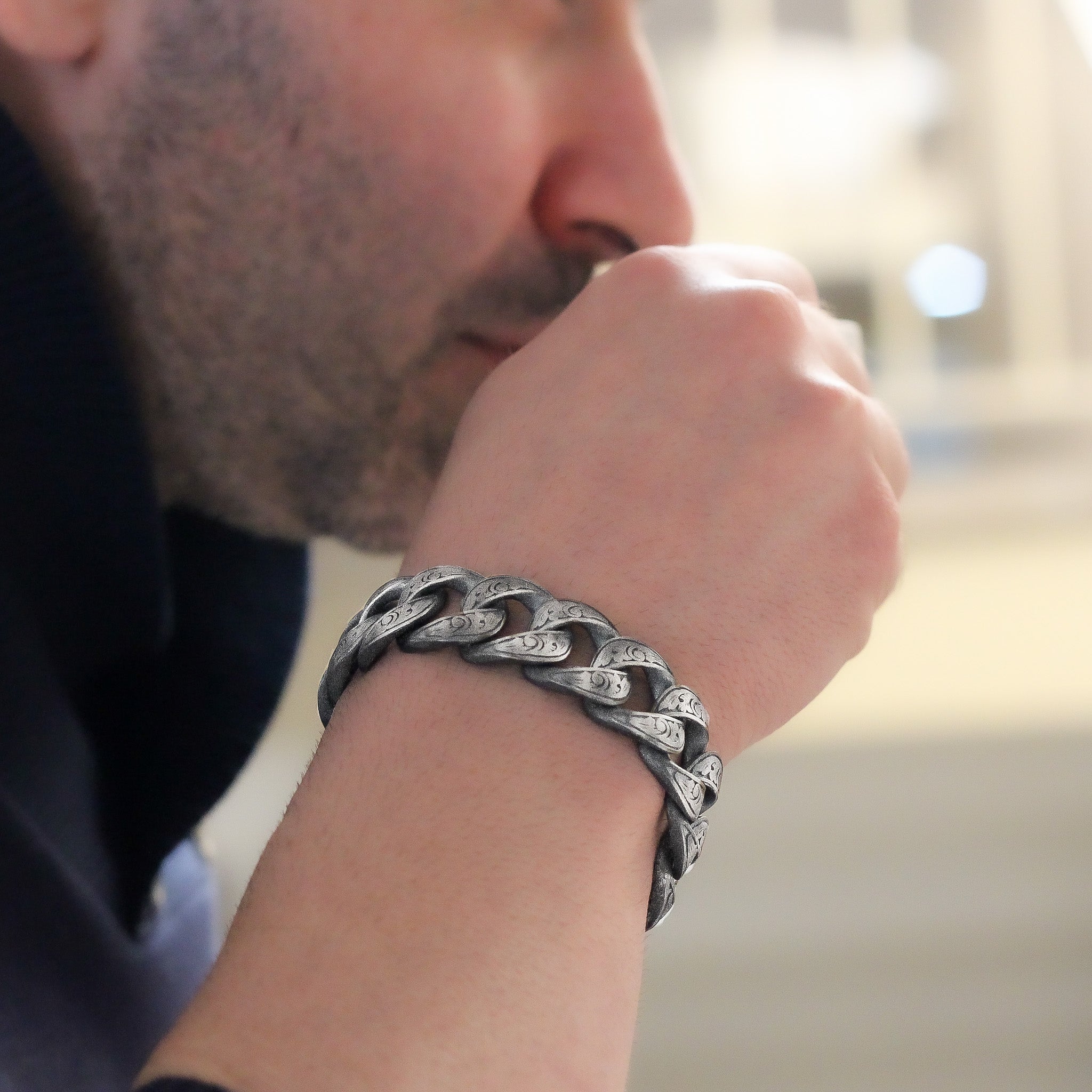Elevate your look with the Sterling Silver Men’s Engraved Bracelet, a striking blend of artistry and resilience. Each bold chain link is etched with intricate patterns, creating a design that’s as durable as it is refined. Handcrafted from solid 925 sterling silver, this bracelet embodies timeless masculinity—making it the perfect choice for everyday wear or special occasions when you want to command attention with understated sophistication.