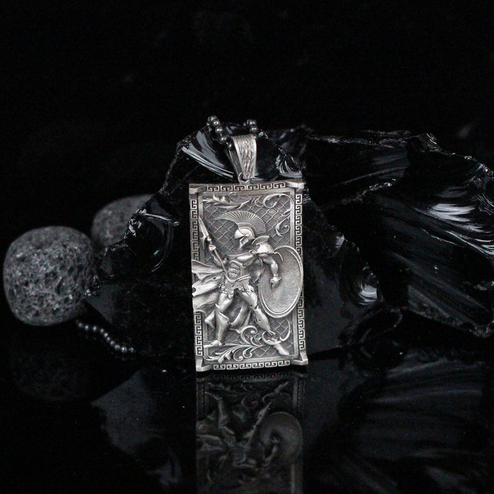 Carry the valor of ancient warriors with the Spartan Warrior Pendant Necklace, a powerful piece crafted from 925 sterling silver. This detailed pendant depicts a Spartan soldier clad in full battle armor, holding both shield and spear, framed within a bold rectangular design. Finished with Greek-inspired borders, it embodies courage, heritage, and timeless style—an ideal choice for history lovers or anyone drawn to meaningful, statement jewelry.